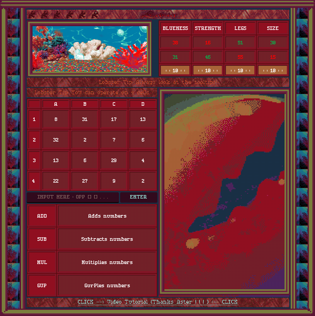 Partial to nothing, the Lobster grants a visage into the nearby truth. Perhaps you can find a glimpse of what it has to say.